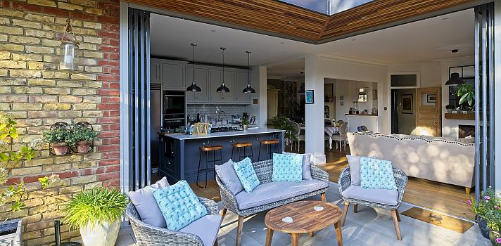 Stunning corner-opening frameless glass doors create a seamless connection between this contemporary Essex kitchen extension and a stylish outdoor living space.