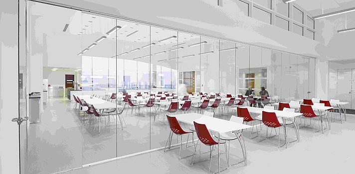 The frameless design creates striking visual impact while maintaining the modern aesthetic of the facility. When open, the space transforms into a larger, unified area; when closed, it maintains clear sight lines while providing acoustic separation.