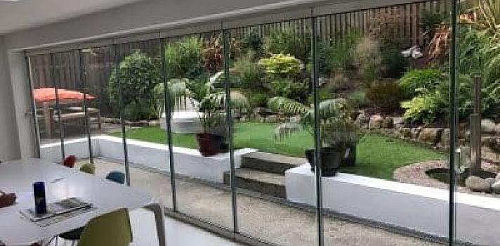 Expansive 8-panel slide and fold glass doors from FGC transform this Preston home, creating a stunning panoramic glass wall that seamlessly connects the interior to the lush outdoor garden. The low threshold provides easy access between spaces.
