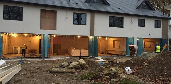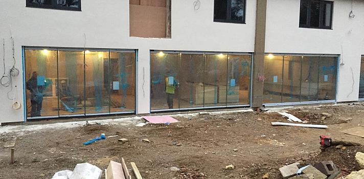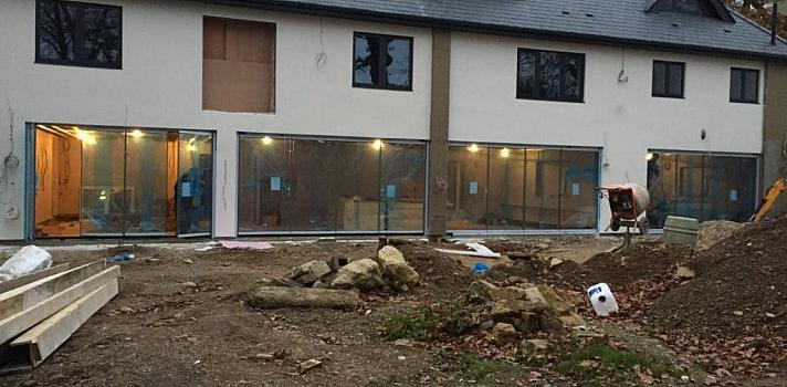 A substantial detached house featuring four sets of our frameless slide and fold doors, across the entire rear elevation.