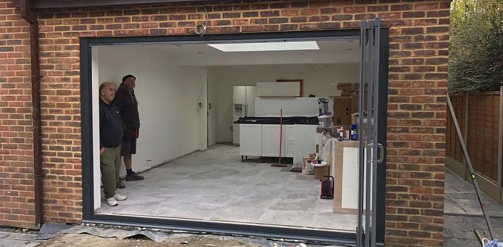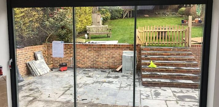 A large three panel slide and fold frameless door in a dark grey contemporary colour. Fitted to a brand new kitchen extension, our frameless doors work well with the lantern roof to provide lots of light from two sides. They also provide great view out to the patio area and feature a flush floor on the inside with the stone floor tiles, up to the low door threshold.