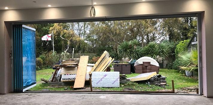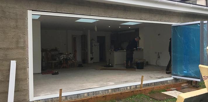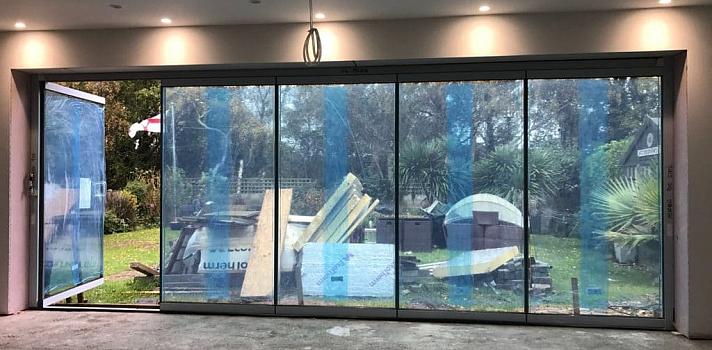 A Dorset house with a new extension featuring our frameless slide and fold doors. While the building work continues, we help minimise damage to the doors by fully protecting the primary surfaces with special low tack glass and frame tapes.