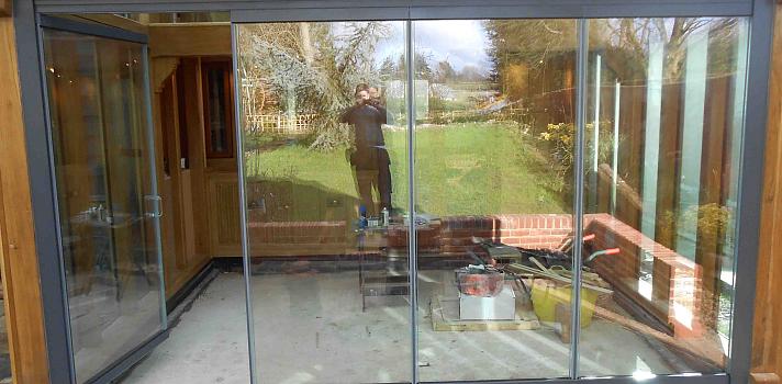 - Contemporary frameless doors complement glass roof and wooden structure.