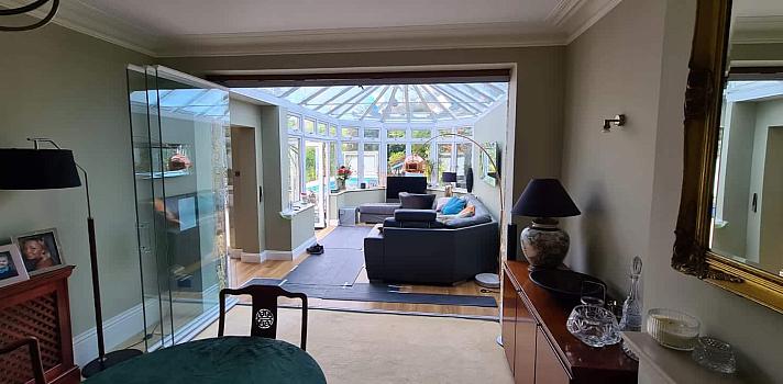 Separating the living room from the existing conservatory and replacing the previous set of doors, is a frameless room divider in Essex. These doors create a glass barrier between the two spaces whilst providing an aesthetically pleasing look, thanks to our cleverly designed room dividers with no visible mullions.