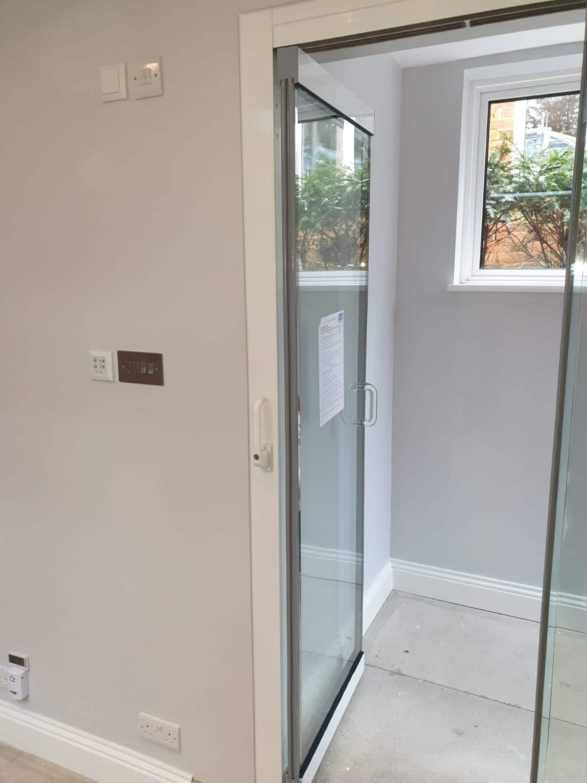 A set of double interior frameless doors in Fleet, Hampshire. The doors have aluminium rails to the top and bottom of the door leaves, with the rest of the door set in our frameless design with no visible mullions.