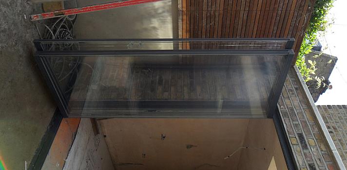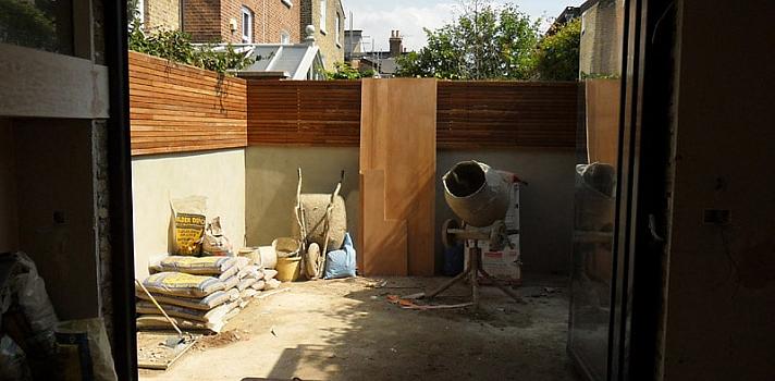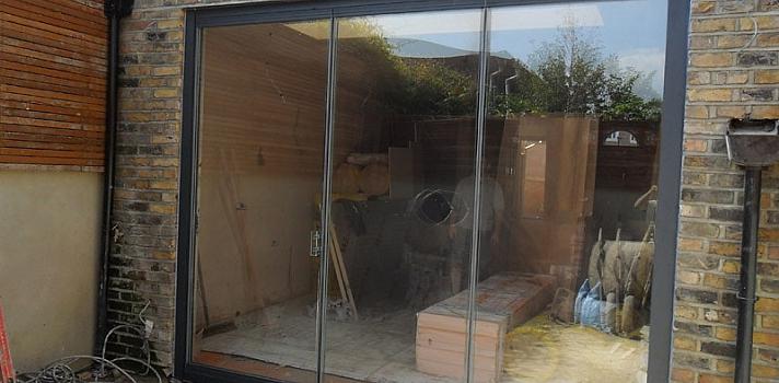 - An installation of frameless slide and fold doors leading out to patio garden.