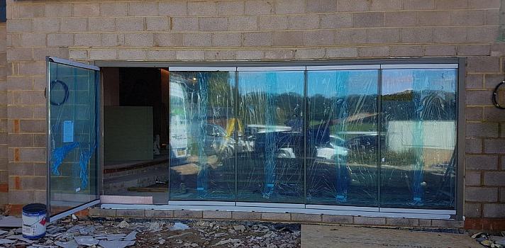 This Hampshire property has been renovated with a new glazed extension. It features a five door and a four door set of frameless glass curtains giving nine door panels. These door sets will transform the back of this house when the project is completed.