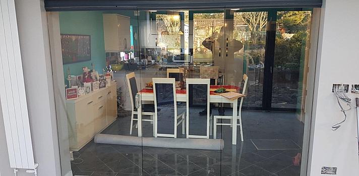 An internal set of frameless slide and fold doors fitted as a room divider to separate the kitchen from the living space with external bifolding doors. A great way to divide two spaces with a frameless solution, providing one or two rooms as desired.