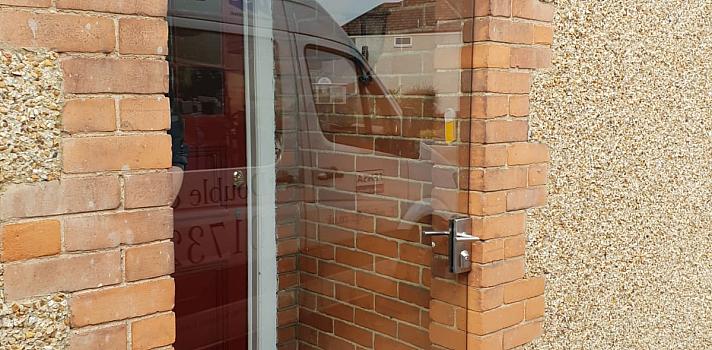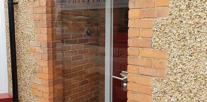 The door comes single glazed with toughened safety glass and a curved head. The door is hinged on the left and opening out viewed from the outside. Its generous size at 1081mm wide and nearly 2.4 metres high creates a light-filled space, also protected from the weather and creating a more welcoming entrance.
