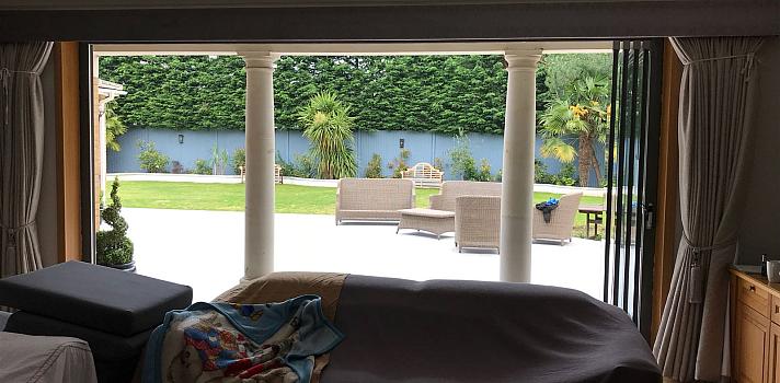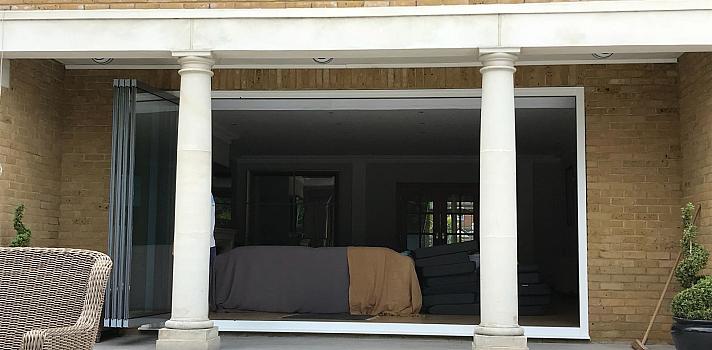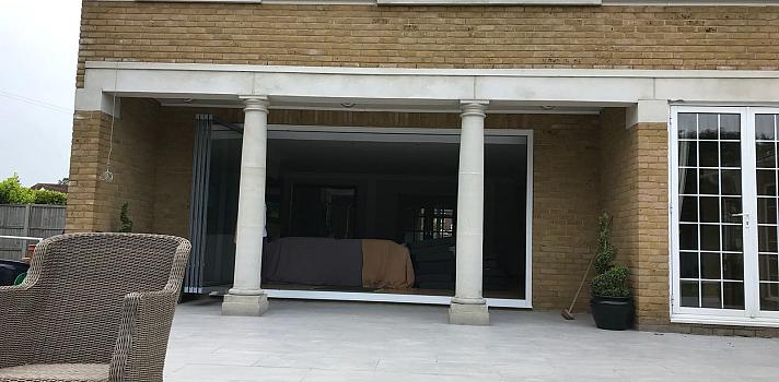 A modern detached house in Ilford, Essex with the existing doors replaced with a frameless slide and fold door. The doors are in a four panel design, opening outwards and with a low threshold.