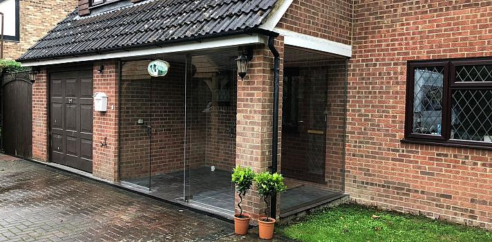 A modern Kent house substantially improved at the front thanks to our modern, two-sided frameless glass porch.
