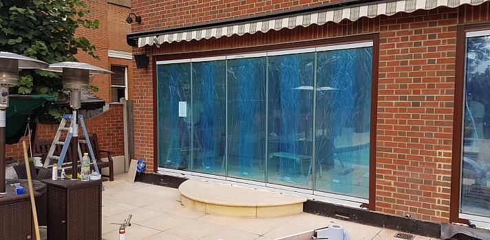 A London installation to the rear of a recently built house of two sets of frameless slide and fold doors.