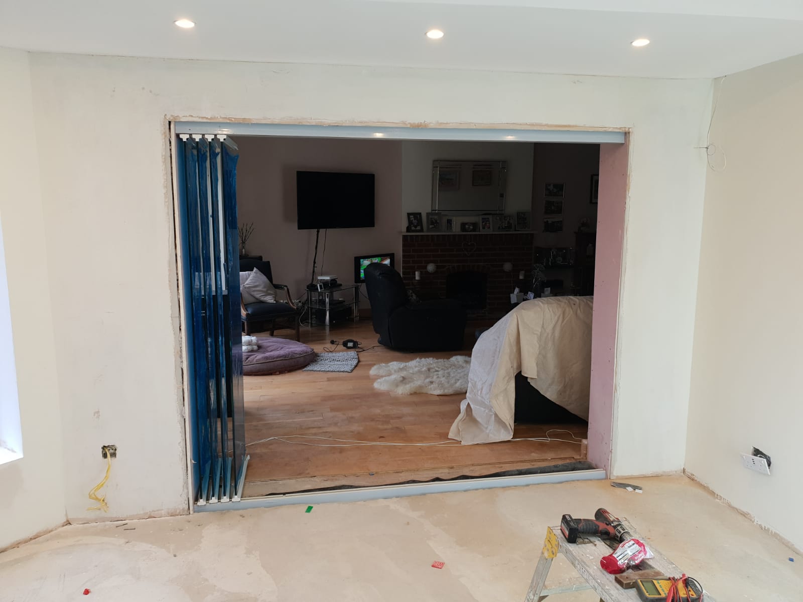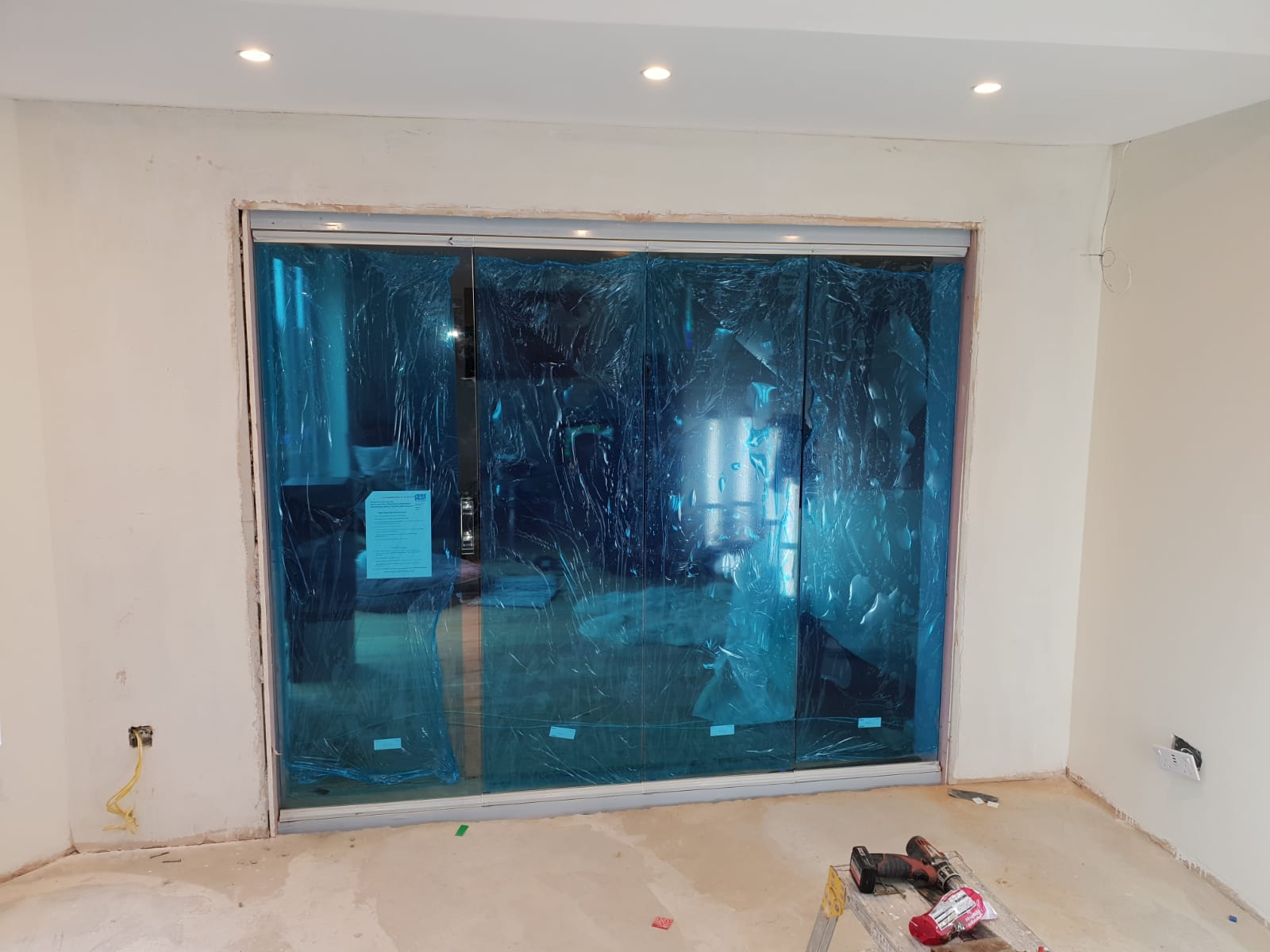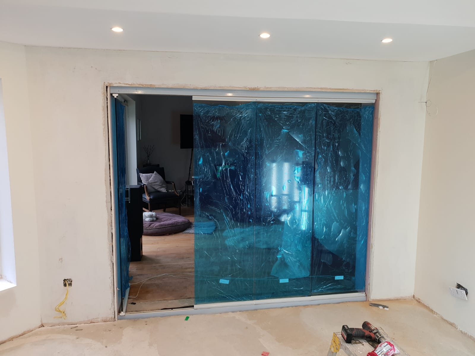 The fully glazed door panels stack neatly to the one side while also providing a seamless link from one room to the other. This is possible thanks to the ultra-low threshold, another feature of our innovative glass doors. Finally, a contemporary square door handle lets the user open and close the lead door comfortably. As the pictures show, the property is still undergoing renovation. Therefore our doors come well protected with blue protecting sheet over the glass, the client can remove when ready.