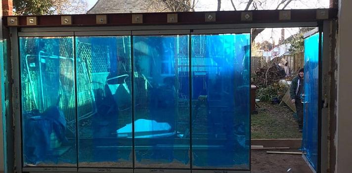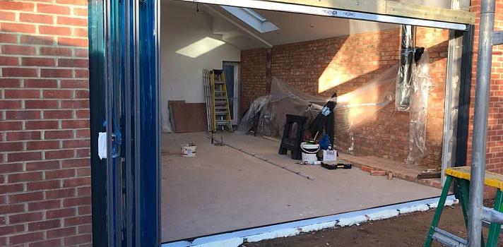 A new extension under construction, fitted with a 5-panel set of framelss glass slide and fold doors and featuring a gable glazed light above.