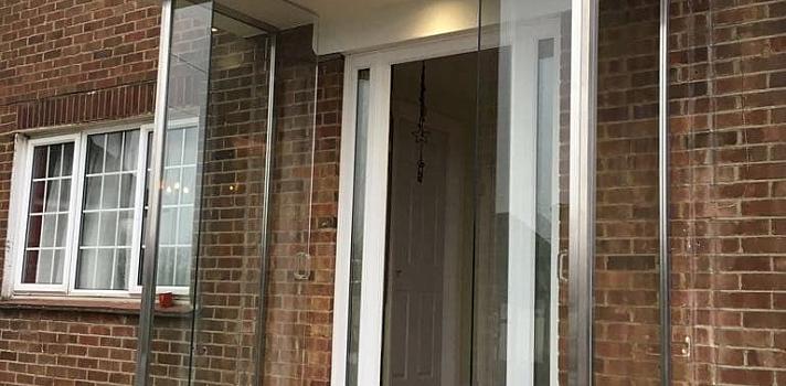 - Frameless entrance porch, single glazed with 12mm toughened glass.