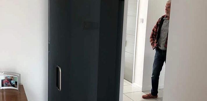 The door is 10mm single glazed hinged on the left, viewed from the outside. To provide privacy we use smoked grey glass that offers a level of privacy with some transparency as well.