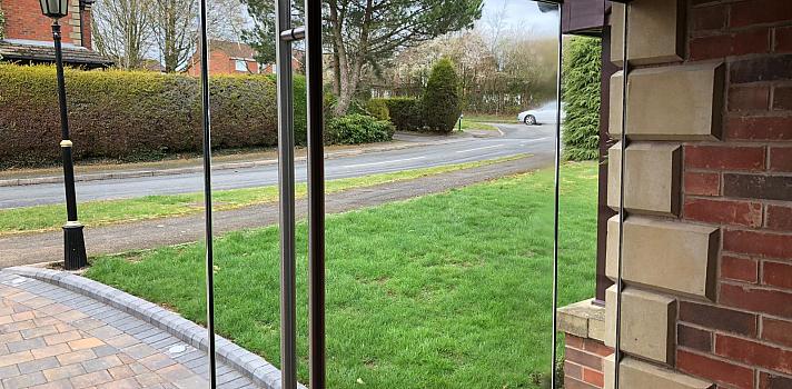 First of all, is the expansive glass at the front of the property having a single door and side panel. The porch comes in our 10mm quality toughened glass, at an overall size of 2.13metres wide and 2.1 metres high. The porch door is locking, having a two-part lock on the door leaf and the fixed side panel. Also provided within the side-panel glass is a metal letter plate, expertly fitted within the single glass.