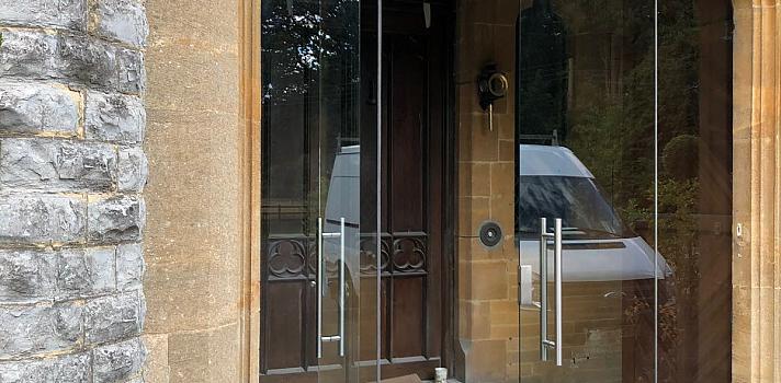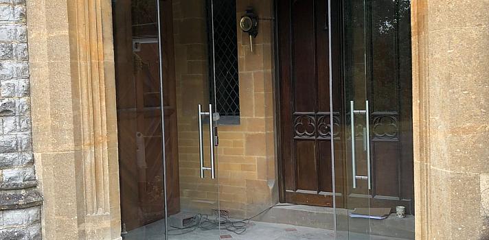 An installation in the West Midlands of a frameless set of single glazed doors with feature toplight in a gothic stone arch.