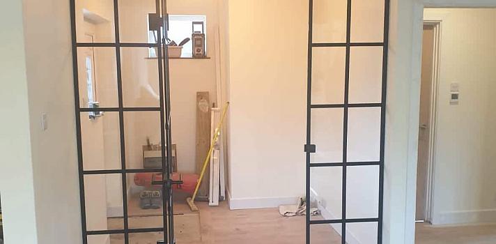 Moreover, achieving the right look to this steel-look internal screen in Surrey is all about craftsmanship. First of all we make our bespoke internal glass doors. But here, we powder coat all the hardware in the same durable black finish. We then professionally apply a series of glazing bars, creating the metal grid. These slimline glazing bars combine with the minimal metal edges of the doors and the result is excellent.