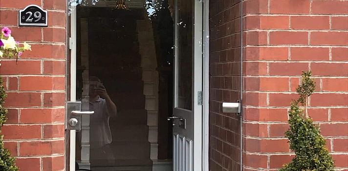 One of our porch installations in West Yorkshire, featuring our frameless glass porch with curved fanlight. This modern porch door with a minimalist appearance works well with the redbrick eternal was and matches the curved step on the path.