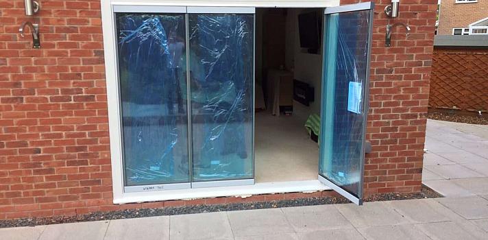 A Worcestershire installation of frameless slide and fold doors fitted to an existing opening. Doors lead out to the modern paved patio and maximise the garden views.