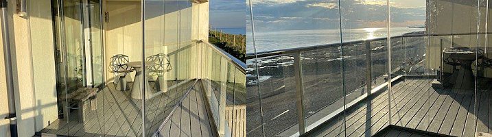 The image shows this product installed in a Brighton property on a large balcony. Fitted at an angle coming in from the balustrade, allowing the full use of the space when fully open. Closed or open, the glass and no visible mullions provides views of the coast whether open or closed.
