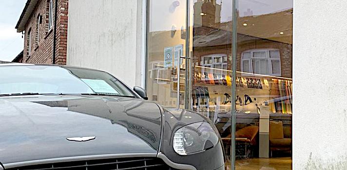 Commercial glazing installation at an Aston Martin dealership in Cheshire, providing seamless vehicle display space while maintaining strict brand standards.
