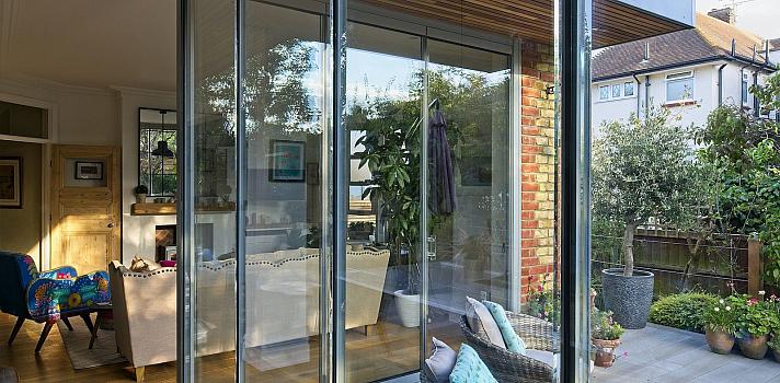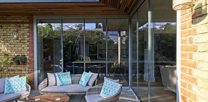Sleek timber cladding and minimal frame profiles complement the modern interior design while harmonising with the property's traditional brick exterior.