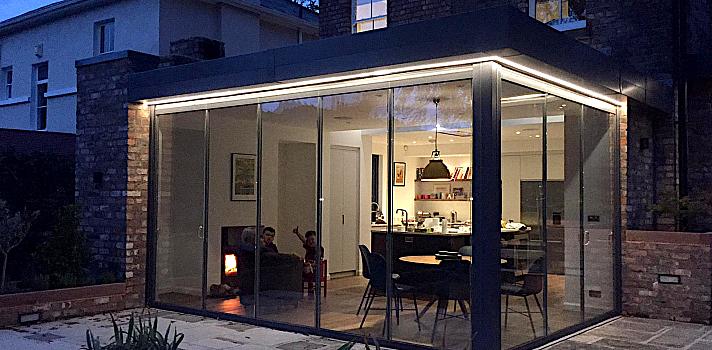 Three, four and five-panel door sets flood this new extension with daylight. The views provided by both the corner set and the standalone doors provide a real feeling of space thanks to our unique design and of course, with no visible mullion. You'll only find these features in our frameless double glazed slide and fold doors.